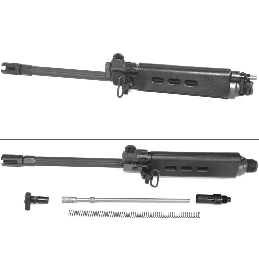 – L1A1 charging handle slide bar is slightly thicker than the metric version. L1A1 can be shaved down to fit a metric receiver. The L1A1 charging handle requires the receiver to be cut in order to engage the folding lever and lock it in the forward position. – Bolt & bolt carrier will interchange as complete assemblies however extractors and firing pins do not interchange. – Muzzle end barrel threads are 9/16×24 TPI right hand on the L1A1 but left hand on most metric versions. Some Belgian rifles can be found with either or. Early Belgian rifle can be right hand. – Top covers on the L1A1 have 2 protruding ears on the bottom rear that fit into recesses milled into the upper receiver. Metric top covers do not have these ears. |