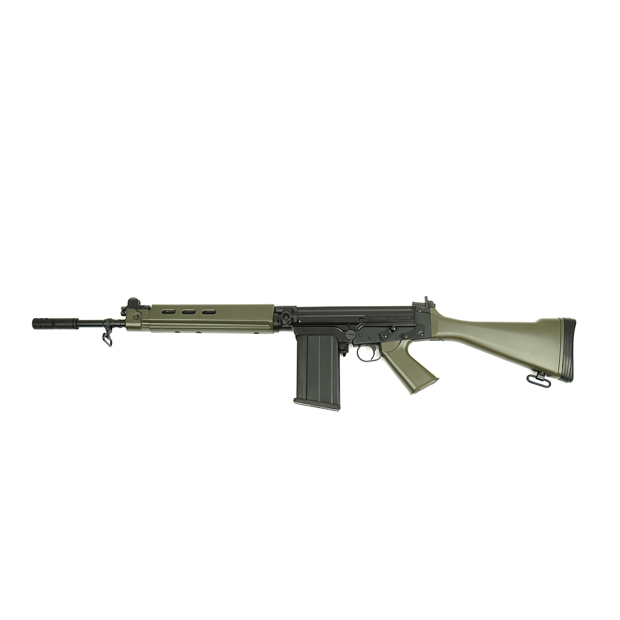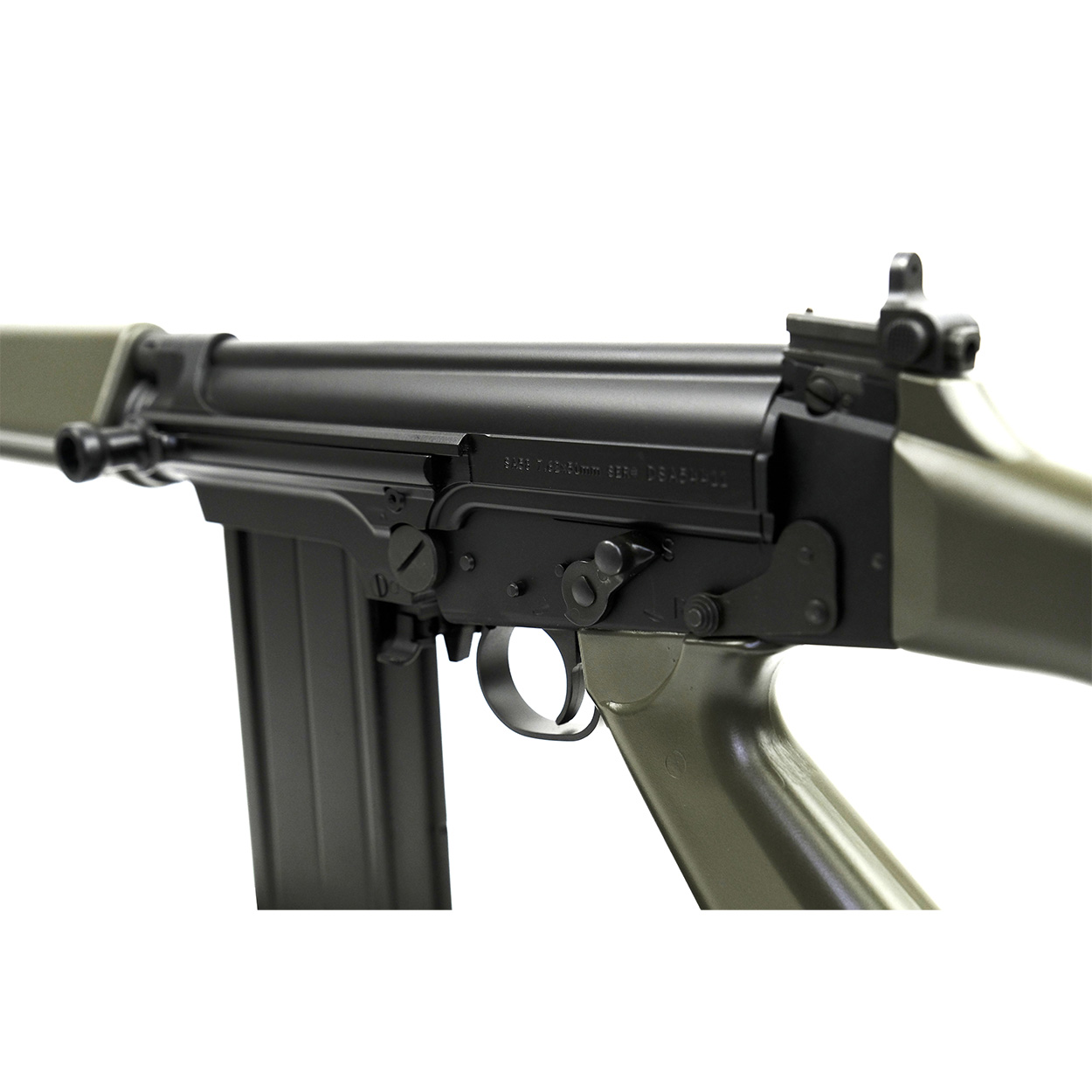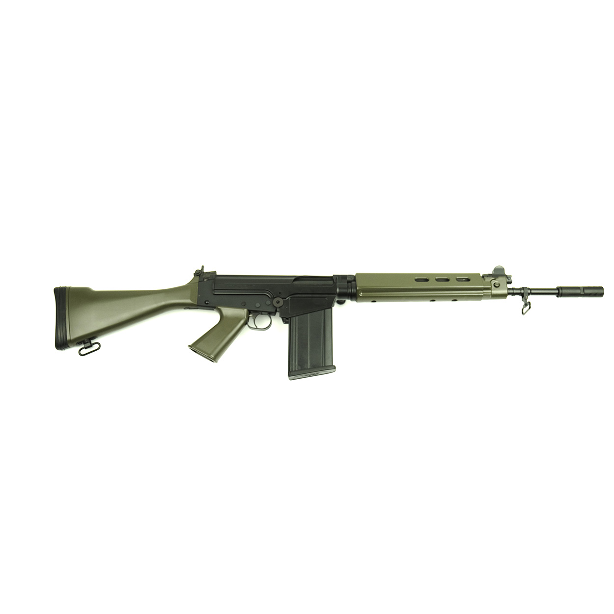 This classic FAL rifle features a Matte Black DuraCoat finish on the steel & aluminum and OD Green DuraCoat furniture; Pistol Grip, Full Length Belgian Style Handguards and Humpback Stock.