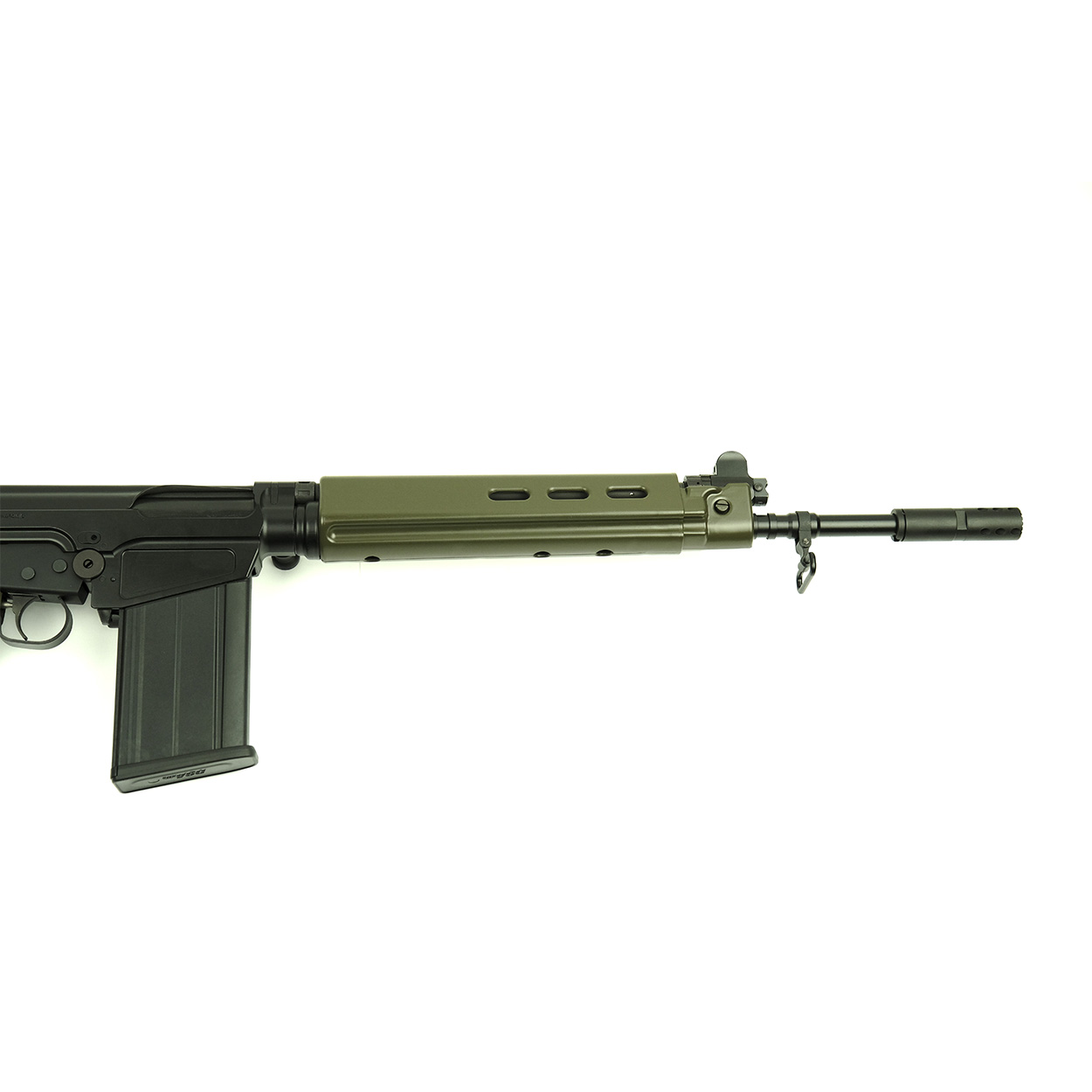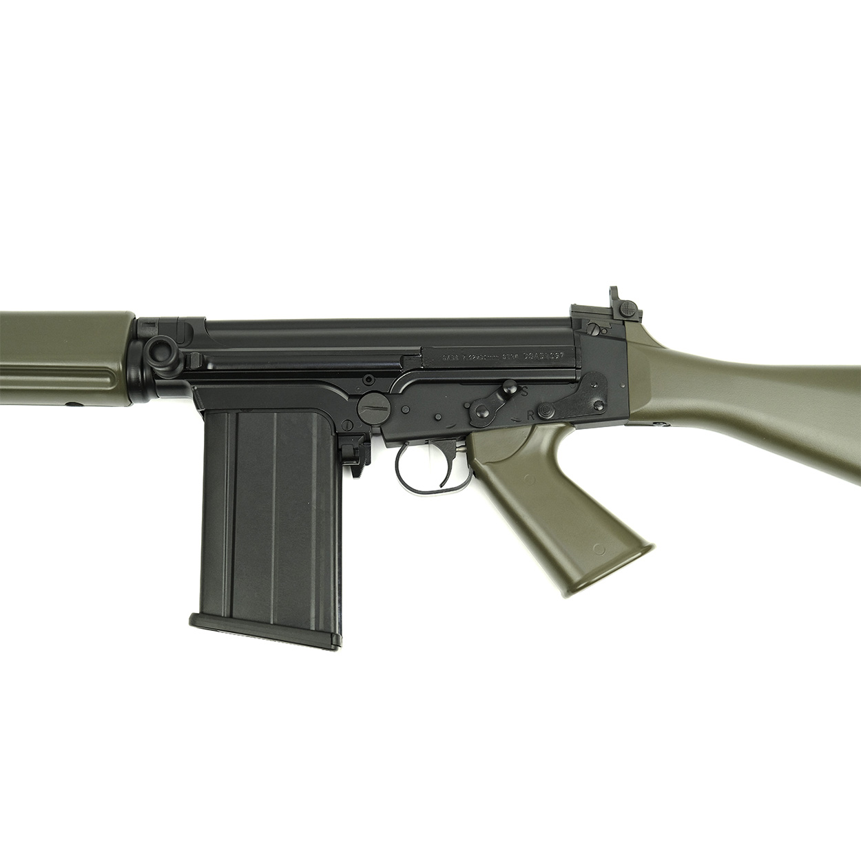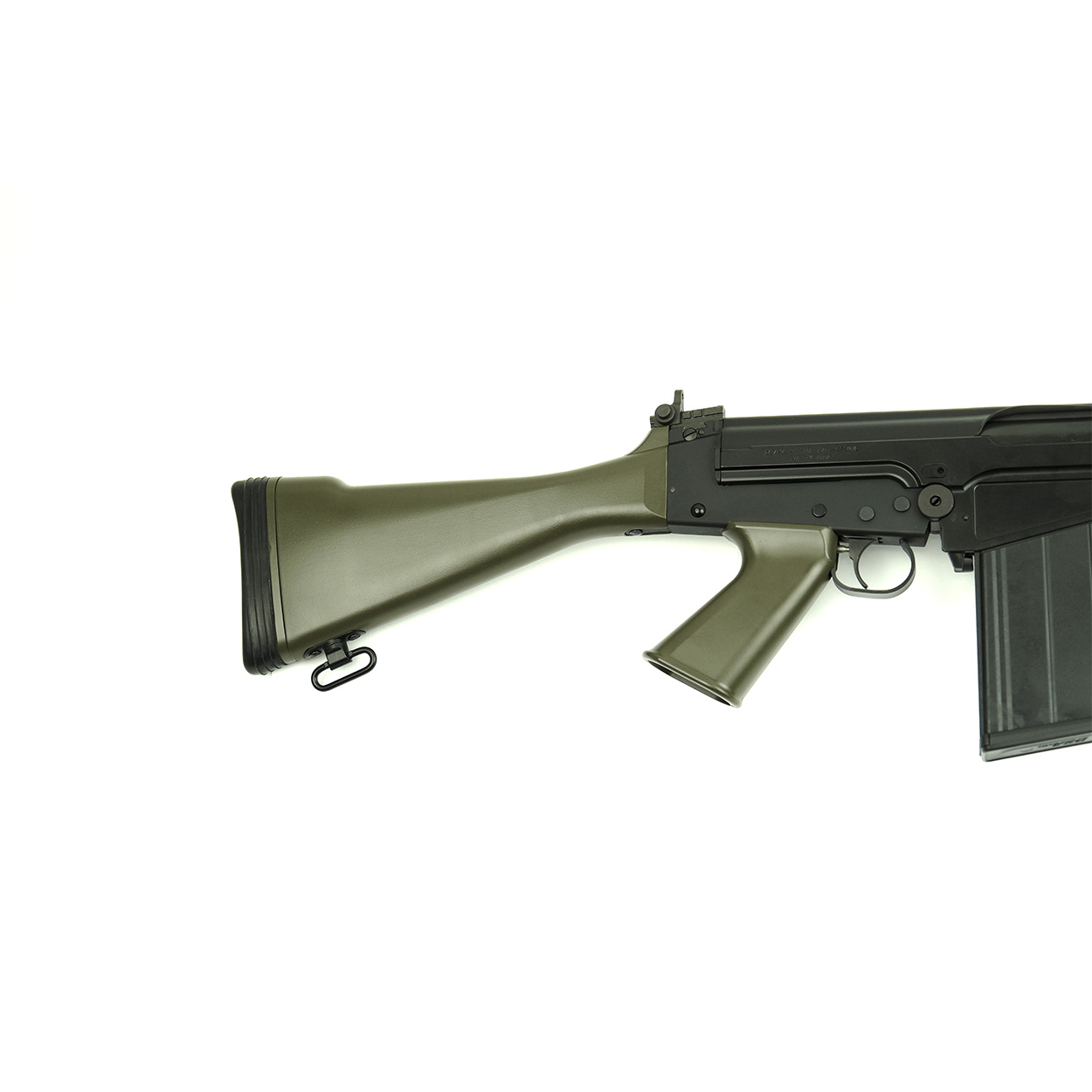 This classic FAL rifle features a Matte Black DuraCoat finish on the steel & aluminum and OD Green DuraCoat furniture; Pistol Grip, Full Length Belgian Style Handguards and Humpback Stock.